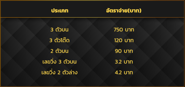 - เลข 3 ตัวบน อัตราการจ่าย คือ 1/750 เช่นซื้อ 10 บาท เท่ากับ 10*750 เท่ากับ 7500 บาท