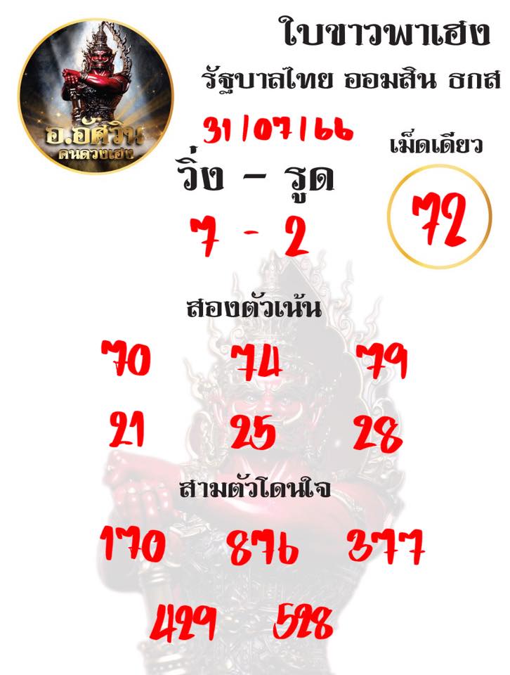 รวบรวมแนวทางหวยไทย งวดประจำวันที่ 31 กรกฎาคม 2566 เลขเด็ดเน้นๆ แม่นๆ ผ่านการคิดวิเคราะห์สูตรเลขเด็ด คัดมาทุกสำนักเซียนดัง จากแหล่งที่เชื่อถือได้ ให้โชคมาแล้วหลายงวดนับครั้งไม่ถ้วน เป็นที่นิยมอย่างมากกับเหล่านักเสี่ยงโค คอหวย เซียนหวยทั้งหลาย มีให้เลือกมากมาย สนใจเลขตัวไหนจับไปเลย ทั้งแบบ 3 ตัว ตรง โต๊ด 2ตัว บน ล่าง นำไปเสี่ยงโชค ลุ้นโชค ซื้อหวยออนไลน์หรือสลากกินแบ่งรัฐบาล