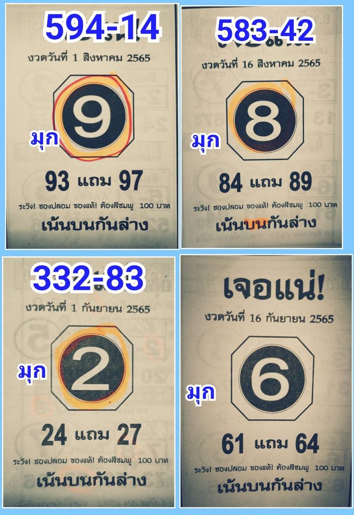 รวบรวมแนวทางหวยไทย งวดวันที่ 16 กันยายน 2565 เลขเด็ดเน้นๆ แม่นๆ ผ่านการคิดวิเคราะห์สูตรเลขเด็ด คัดมาทุกสำนักเซียนดัง จากแหล่งที่เชื่อถือได้ ให้โชคมาแล้วหลายงวดนับครั้งไม่ถ้วน เป็นที่นิยมอย่างมากกับเหล่านักเสี่ยงโค คอหวย เซียนหวยทั้งหลาย มีให้เลือกมากมาย สนใจเลขตัวไหนจับไปเลย ทั้งแบบ 3 ตัว ตรง โต๊ด 2ตัว บน ล่าง นำไปเสี่ยงโชค ลุ้นโชค ซื้อหวยออนไลน์หรือสลากกินแบ่งรัฐบาล
