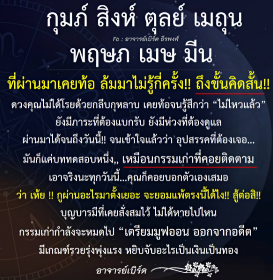 อาจารย์เิบร์ด ธีรพงศ์ ทำนายดวงชะตาผ่านเพจระบุว่า 7 ราศี กรรมเก่ากำลังหมด บารมีที่เคยสั่งสมไว้ ไม่ได้หายไปไหน มีเกณฑ์รวยกะทันหัน รวยรุ่ พุ่งแรง หวังเรื่องเงินๆทองๆ หยิบจับอะไรก็เป็นเงินเป็นทอง ได้แก่ราศีดังต่อไปนี้